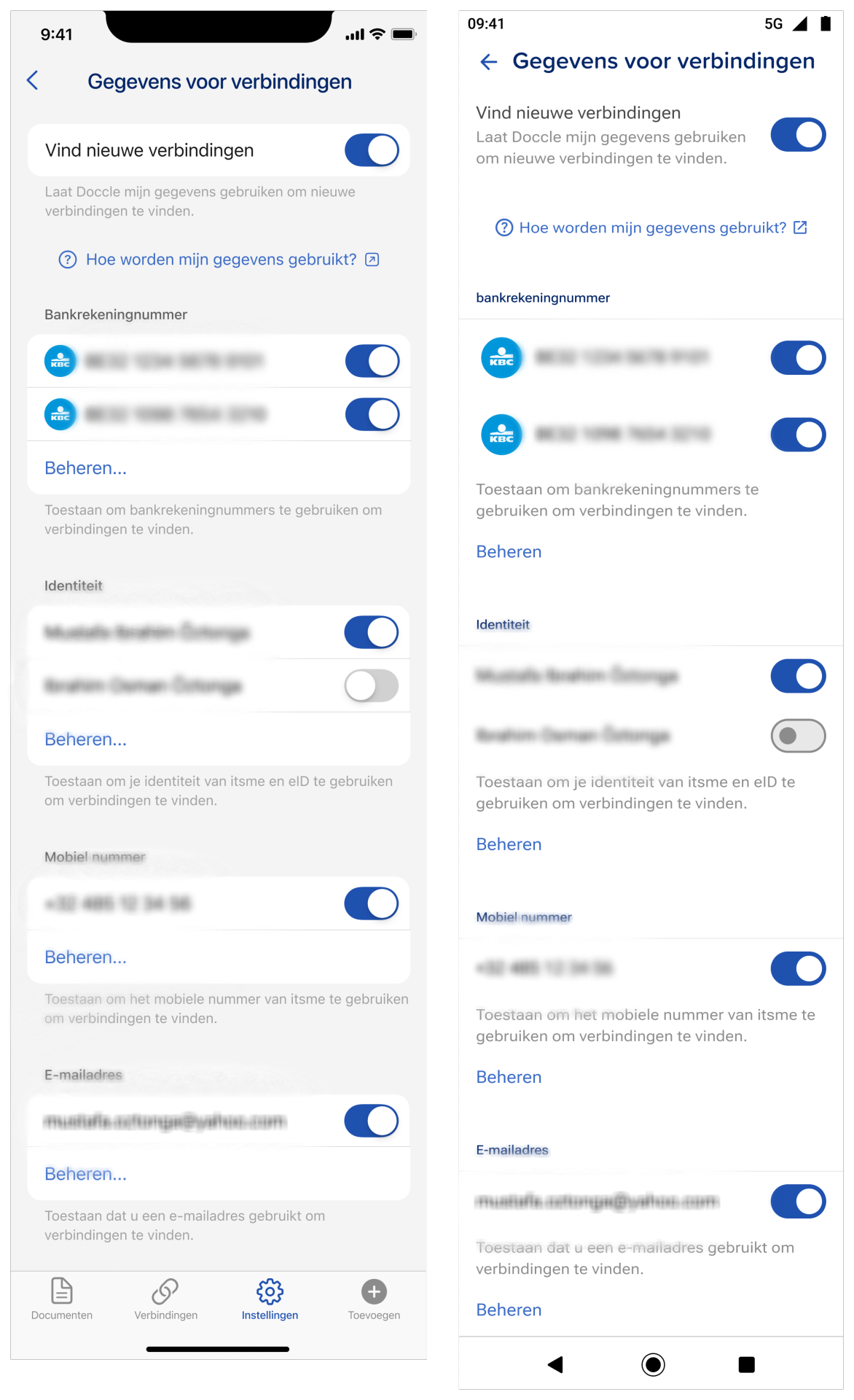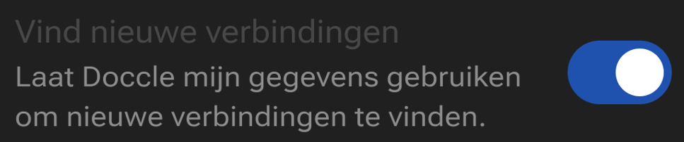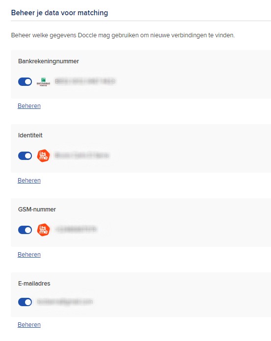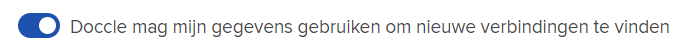 Op het data gebruik scherm ontdek je welke van jouw datapunten door Doccle worden gebruikt om nieuwe verbindingen te vinden en voor te stellen. Een verbinding is een link tussen jou en een organisatie. Nadat de verbinding tot stand is gebracht, kan het aangesloten bedrijf of de aangesloten instelling content met je delen via het Doccle-platform.
