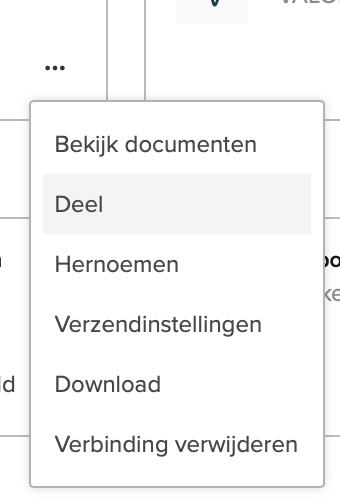 Klik op de drie puntjes bij de verbinding “Peppol – aankoopfacturen” van die verbindingen die nog niet gedeeld zijn, kies Delen en vul het e-mailadres van je klant in.